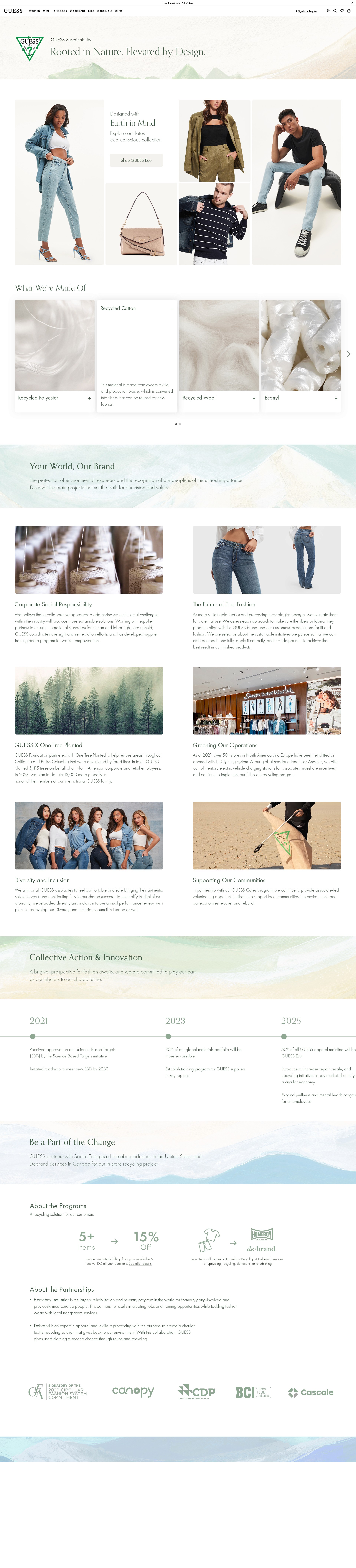 The GUESS Sustainability page brings together the brand’s mission, materials, and initiatives into a single, easy-to-follow experience. With so much information involved, the focus was on creating a structure that helps people explore and understand it at their own pace.